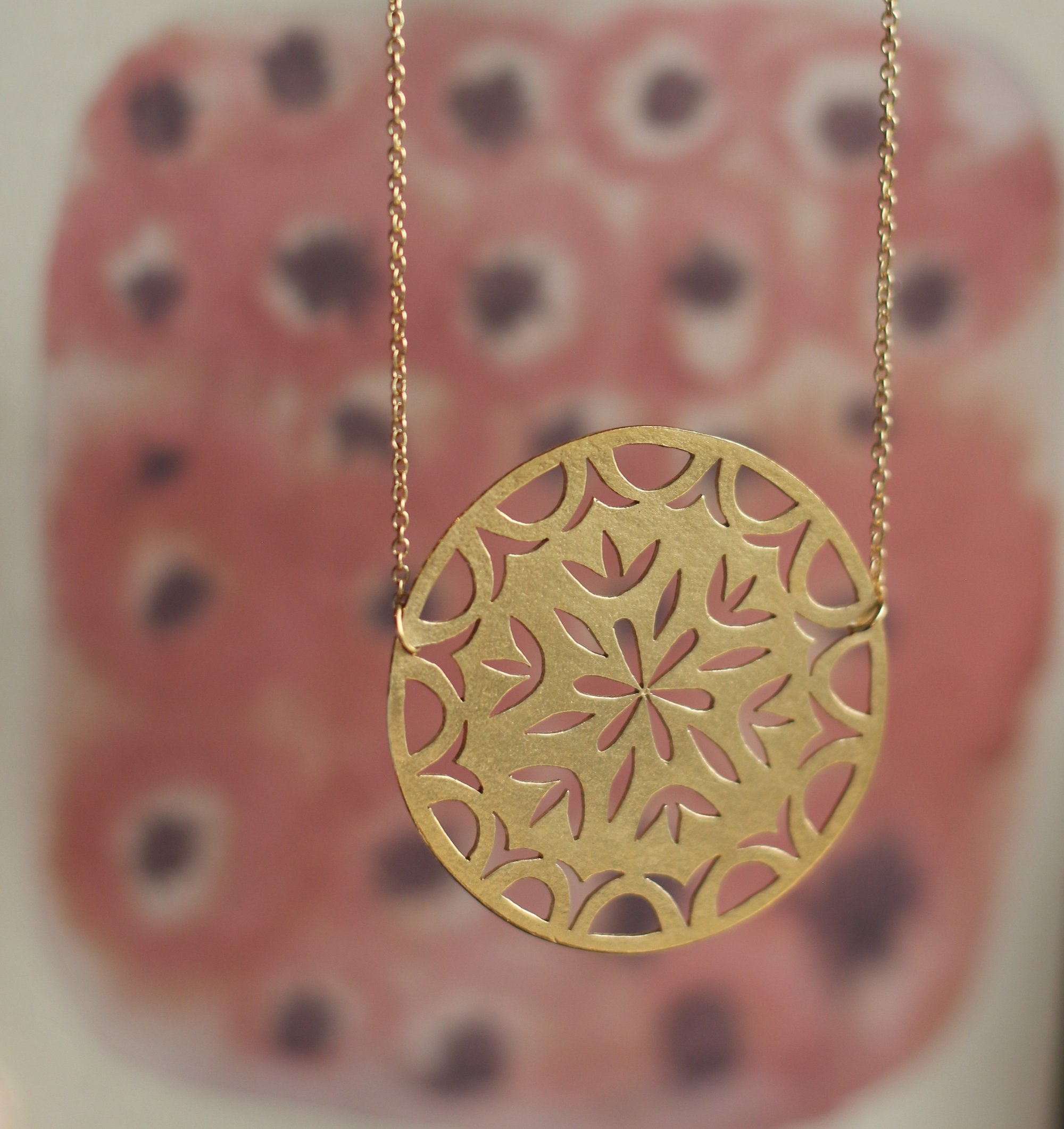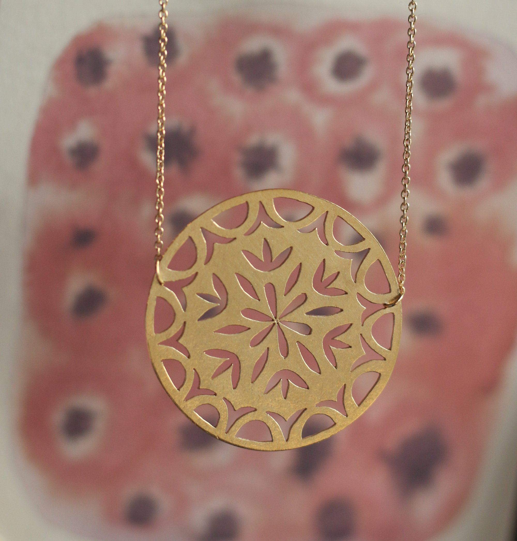 Hand pierced Recycled Silver necklace, Gold plated. These necklaces have a 3 micron gold vermeil finish, which is very durable and long lasting. Each necklace from the Sol collection is hand cut with a jewellers piercing saw, making each pattern unique. These pieces are made to be treasured and worn everyday with love.