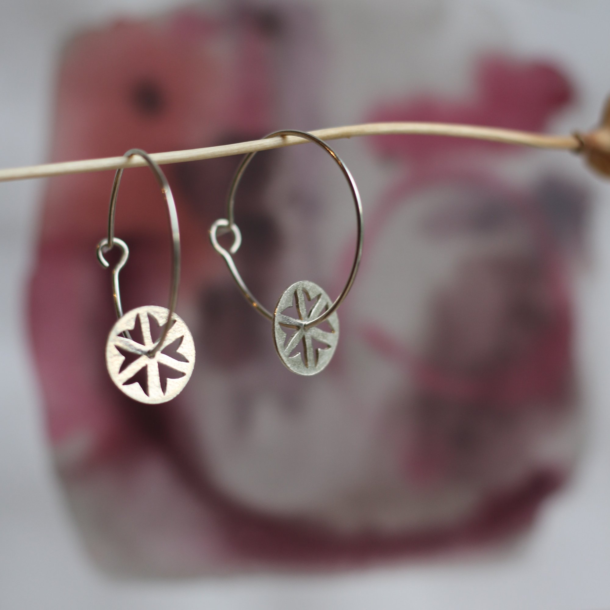 Hand pierced Sol Hoops. in the Ray cut out design. Each piece from the Sol collection is hand cut with a jewellers piercing saw, making each pattern unique. These pieces are made to be treasured and worn everyday with love.